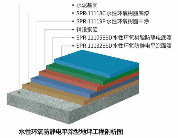 Roller-coated waterborne epoxy resin anti-static topcoat.